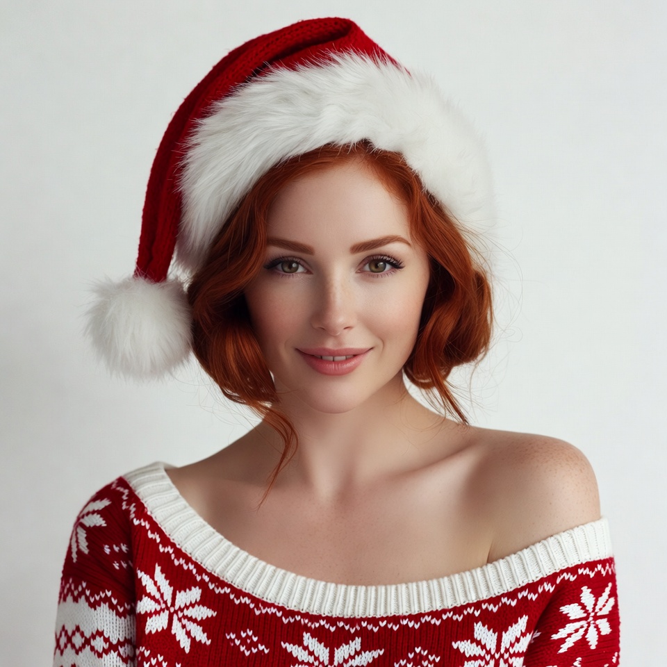 Christmas hat, Santa Claus hat, Santa hat, White, curly hair, female, festive woman, freckles, green eyes, holiday fashion, off shoulder, portrait, red hair, red sweater, redhead, smiling woman, snowflake sweater, white background, woman