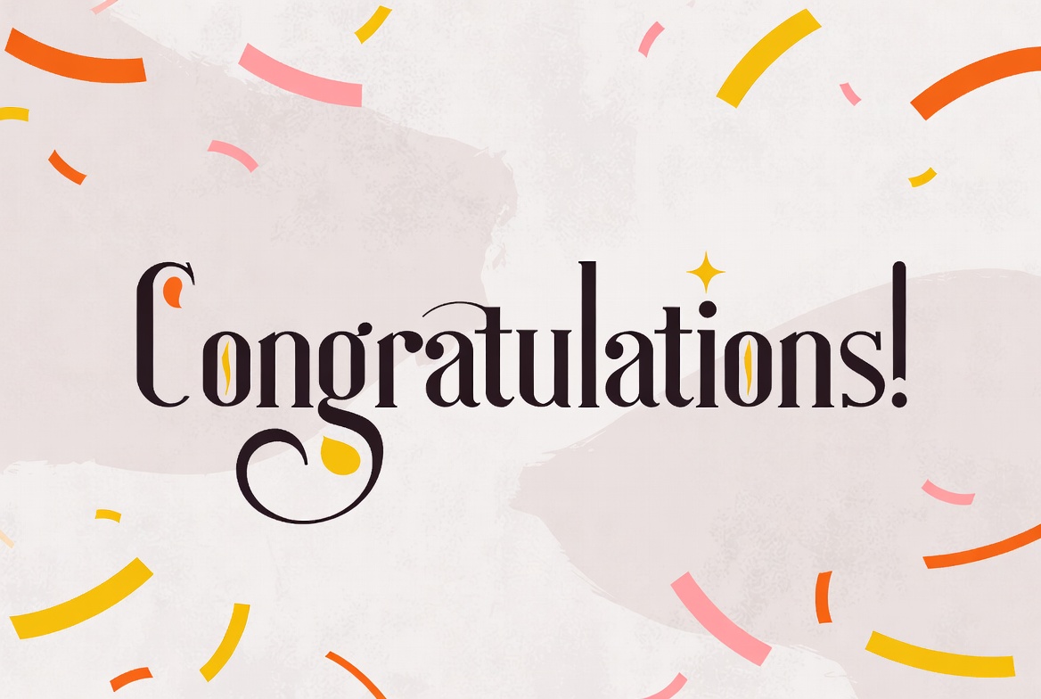 abstract shapes, banner, card, celebratory, colorful, confetti, cursive font, digital art, festive, golden stars, graphic design, illustration, orange shapes, pink background, pink splatters, purple text, splashes, watercolor, yellow confetti, congratulations