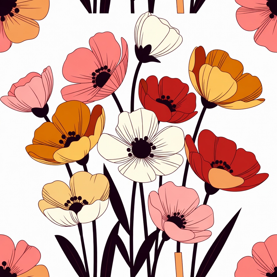 A vibrant seamless pattern features clusters of poppy flowers in pink, red, orange, yellow, and white. The flowers have bold black centers and dark stems on a white background. The design repeats continuously with stylized, flat illustration style.