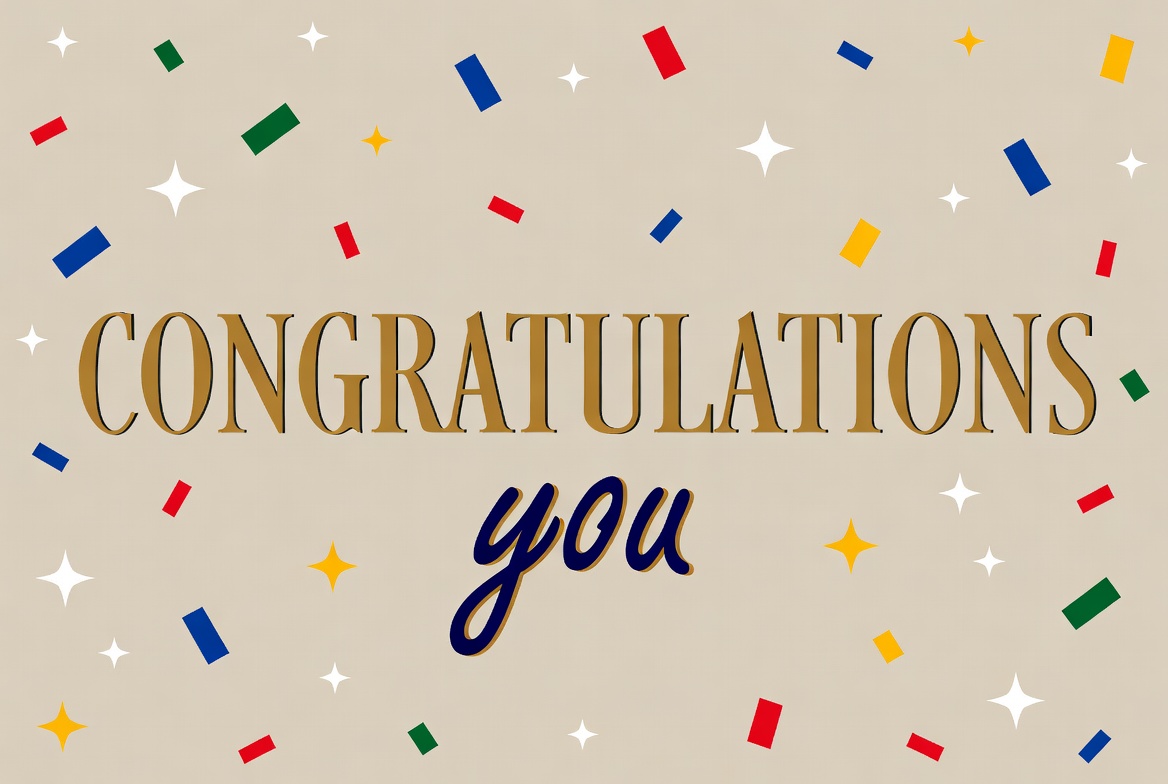 achievement, award, beige background, blue confetti, celebration, clipart, confetti, festive, gold text, graphic design, green confetti, greeting card, illustration, multicolored confetti, party, red confetti, stars, yellow confetti, you, congratulations