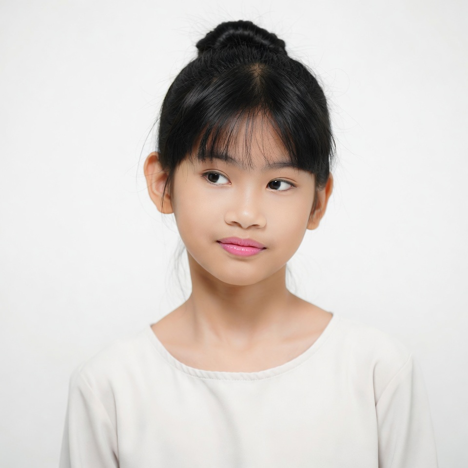 A young Asian girl with straight black hair styled in a bun and bangs stands against a white background. She wears a white off-shoulder top and has pink lipstick on her lips. Her expression is neutral with slightly tilted head.