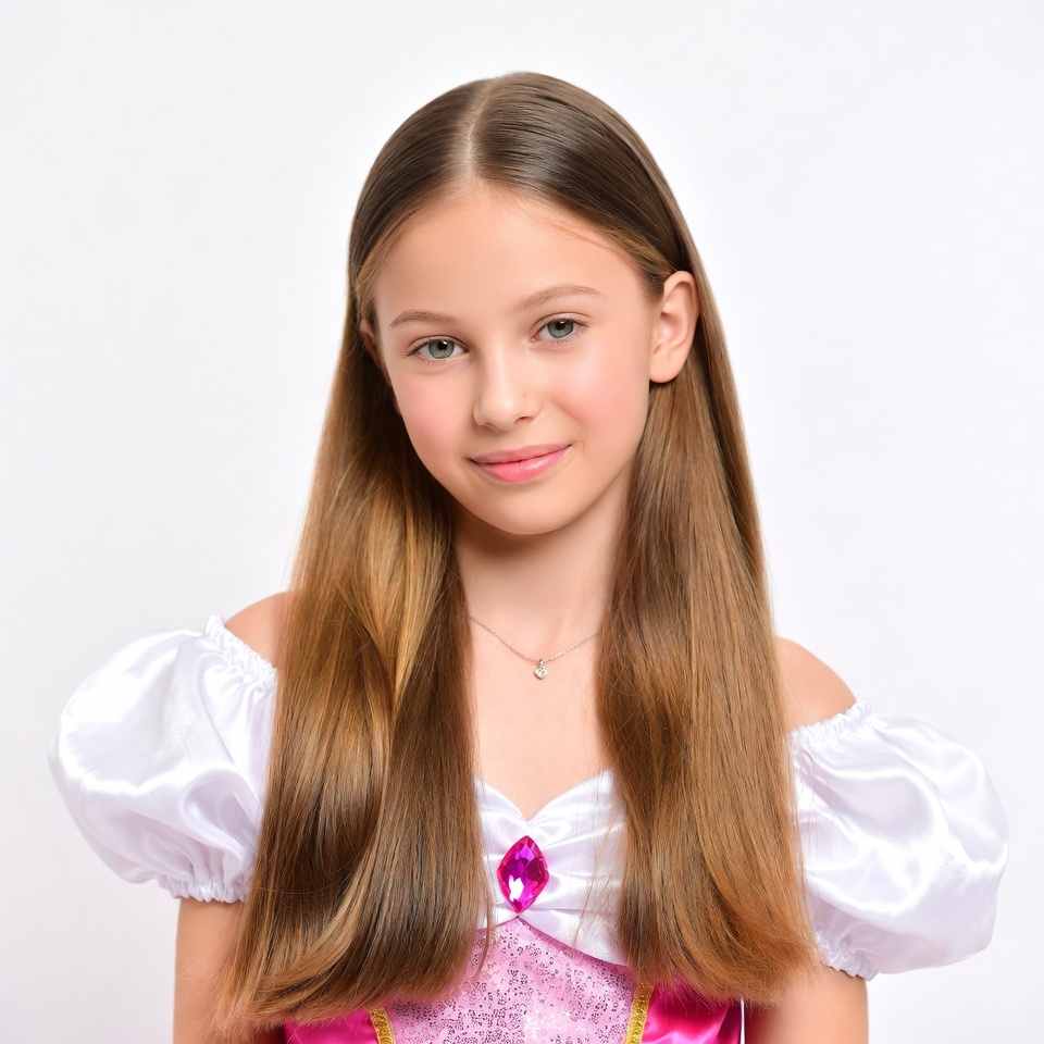 White, brown hair, female, isolated background, long hair, necklace, pink dress, portrait, princess dress, puffy sleeves, smiling, sparkly dress, white sleeves, young girl, girl