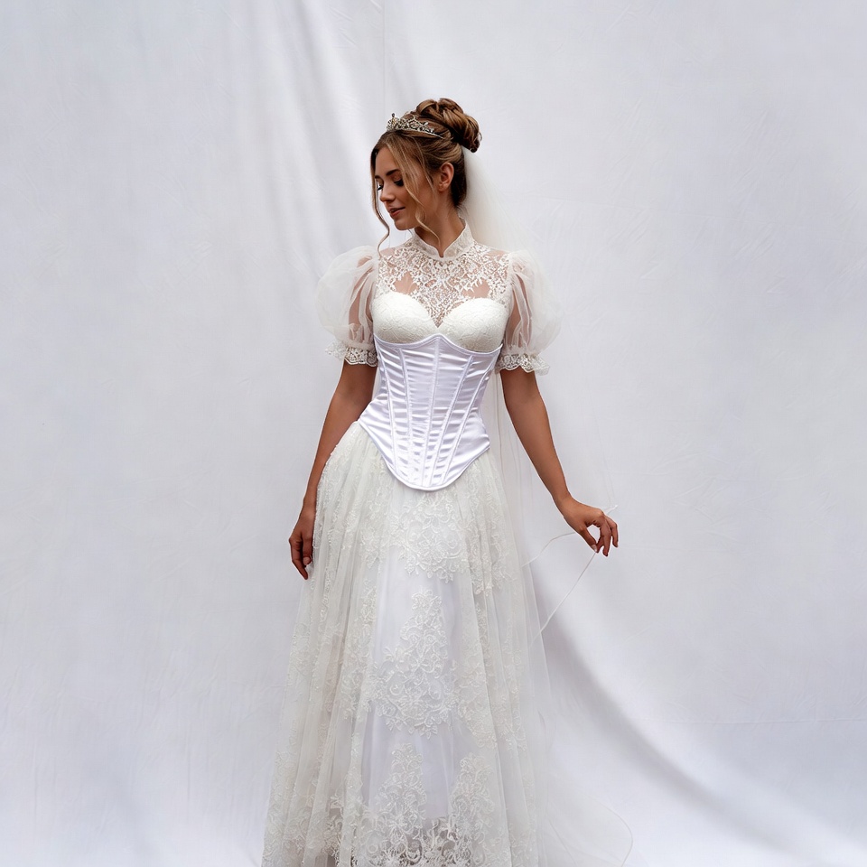 A woman with blonde hair styled in an updo and wearing a tiara stands in a white wedding dress. The dress features a high neckline, lace details, puffed sleeves, a corset bodice, and a full skirt. She poses gracefully against a plain white background.