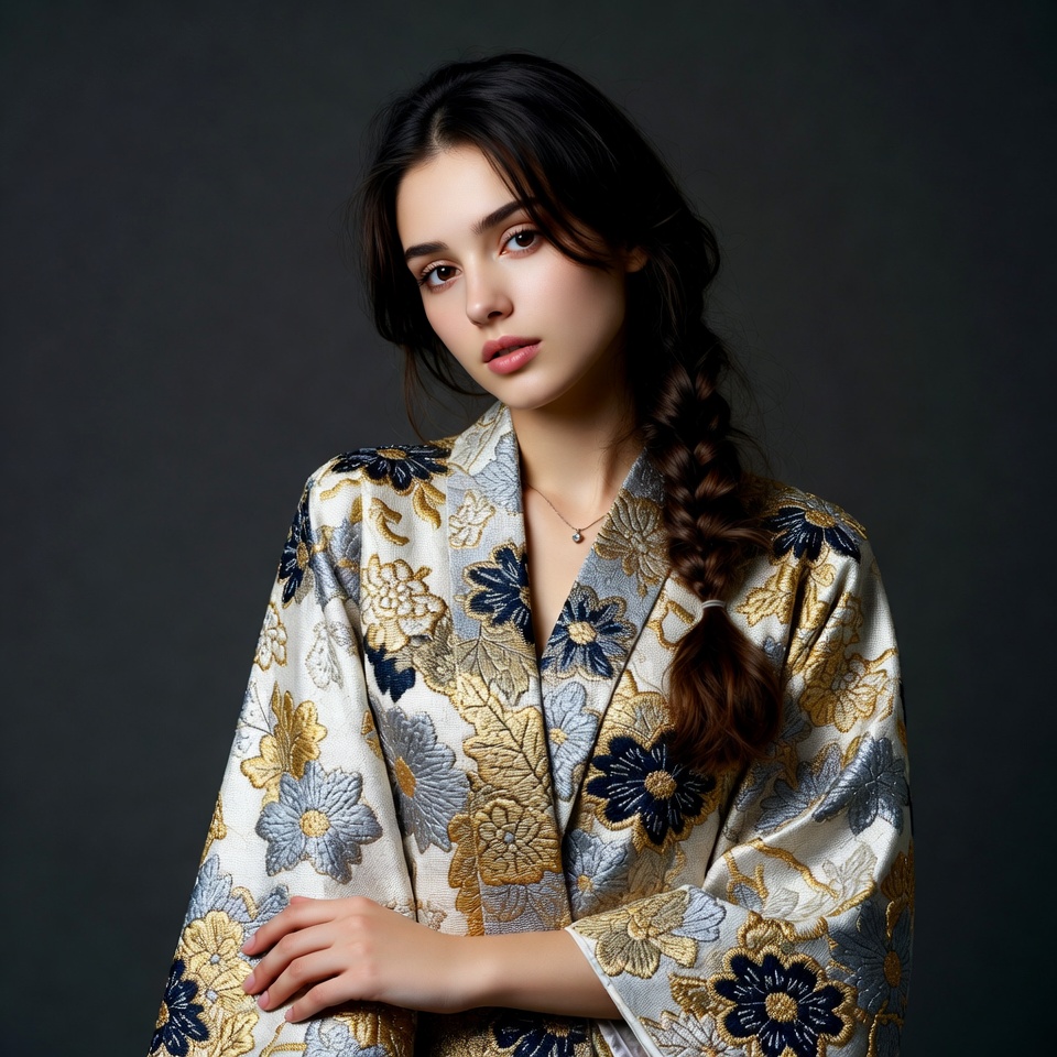Asian fashion, Asian woman, beauty, braid, braided hair, dark hair, elegant, embroidered kimono, fashion, female, floral kimono, gold kimono, isolated background, kimono, long hair, necklace, portrait, robe, studio portrait, traditional clothing, white kimono, young woman, woman