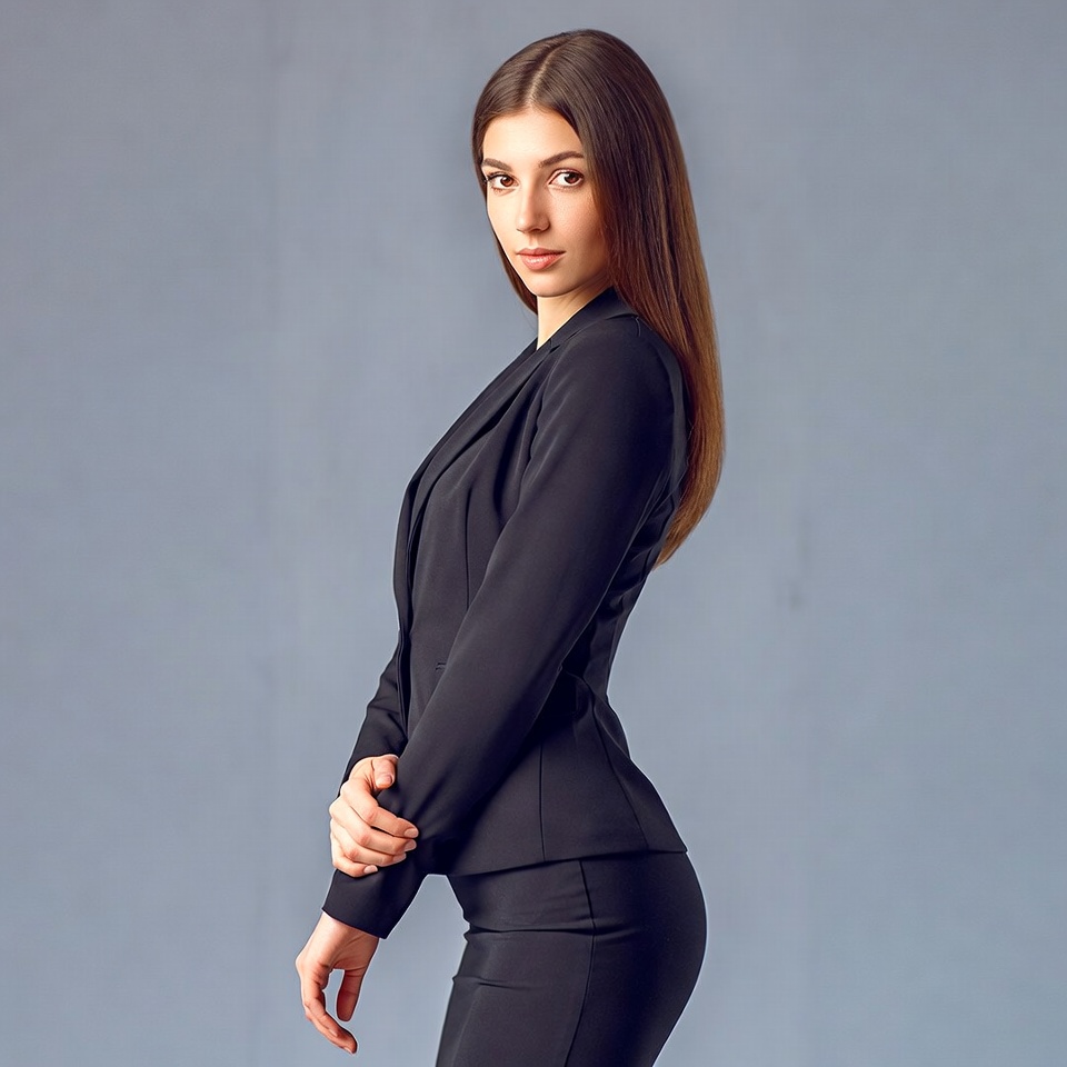 A young woman with long straight brown hair stands in a three-quarter profile view against a plain gray background. She wears a fitted black blazer and matching pants, with her hands clasped in front. Her expression is neutral and poised.
