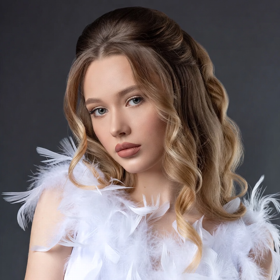 A young woman with long wavy blonde hair styled in a partial updo gazes to the side against a dark background. She wears a white feathered garment draped over her shoulders, highlighting her fair skin and subtle makeup with pink lips. Her expression is soft and contemplative.