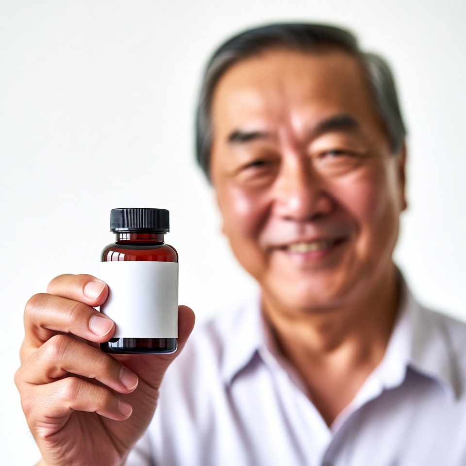 An elderly Asian man with gray hair smiles while holding up a small amber-colored supplement bottle with a white label. He wears a light-colored collared shirt and stands against a plain white background. The bottle is positioned in the foreground with the man's face slightly blurred.