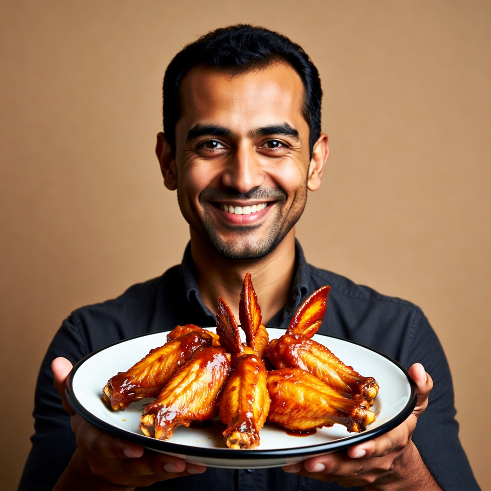 A smiling Middle Eastern man with short dark hair and a trimmed beard holds a white plate filled with glossy orange chicken wings. He wears a black collared shirt and stands against a beige background. The wings are arranged in a circular pattern on the plate.