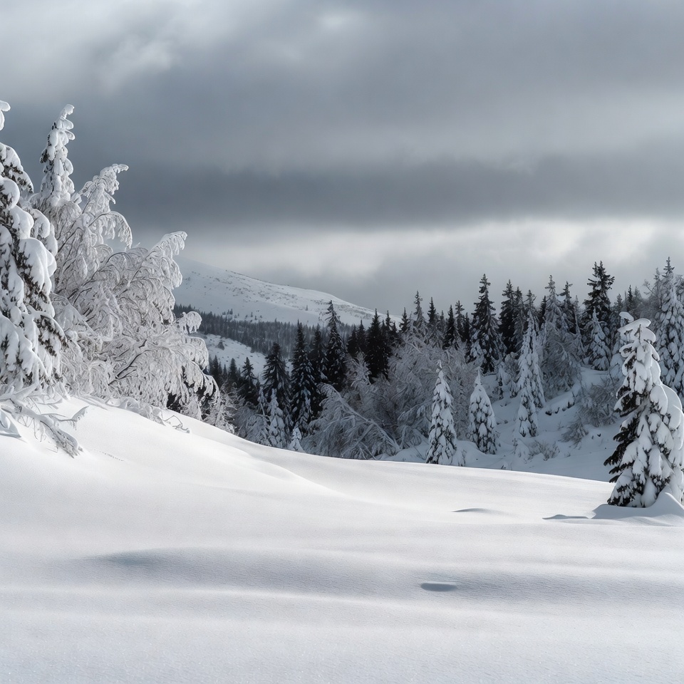alpine winter, cloudy sky, distant peaks, evergreen trees, fir trees, forest snow, gray clouds, heavy snow, mountain view, mountains, nature landscape, pine trees, snow covered, snowscape, snowy field, snowy forest, white snow, winter landscape, winter scene, snowy trees