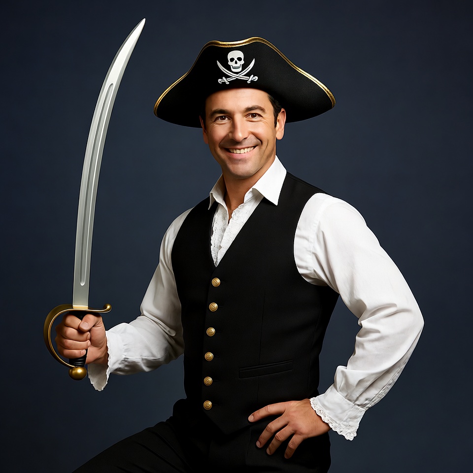 A smiling man dressed in a pirate costume holds a large silver sword in his right hand. He wears a black tricorn hat with a skull and crossbones emblem, a black vest over a white shirt with ruffled cuffs, and black pants. He poses confidently against a dark blue background.