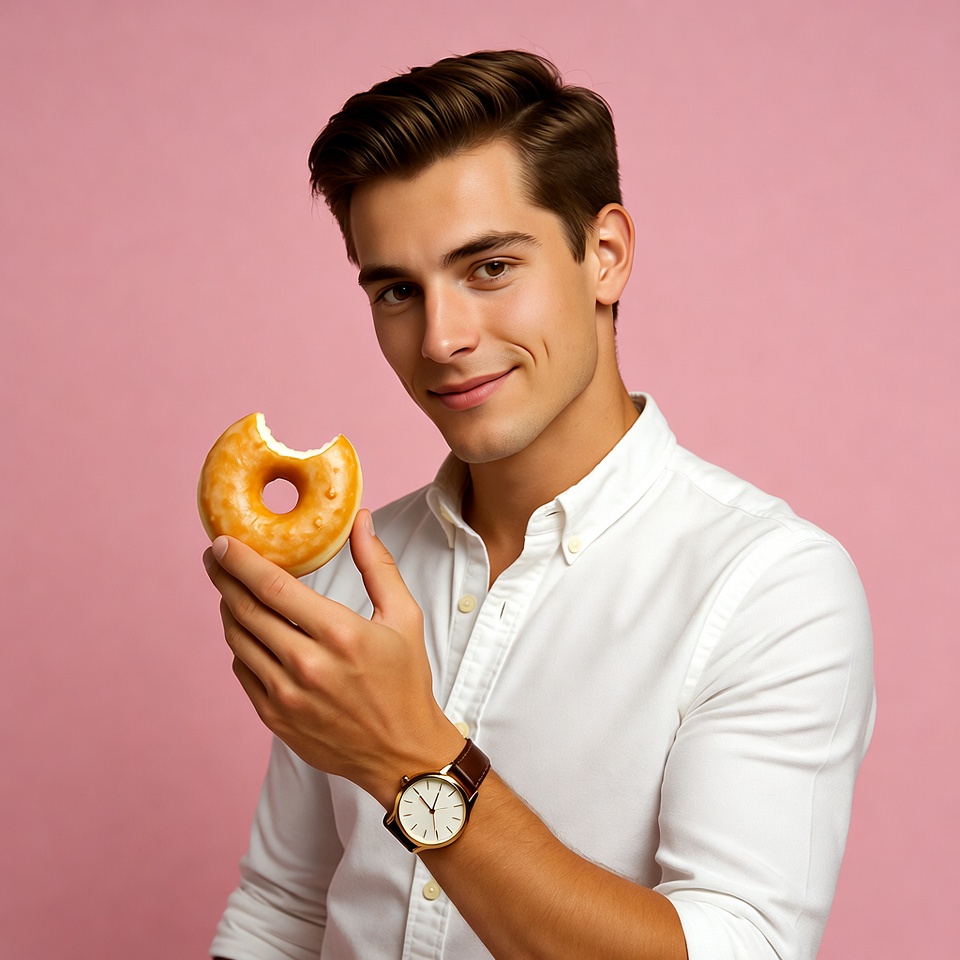 A young man with short brown hair smiles while holding a glazed donut with a bite taken out of it. He wears a white button-up shirt and a gold watch on his wrist. The image is set against a solid pink background.