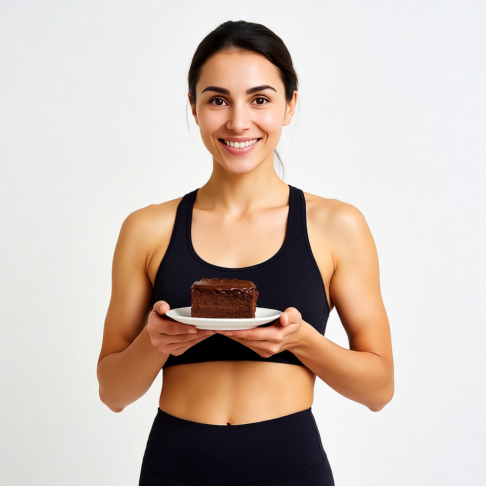 A smiling Latina woman with dark hair stands in a black sports bra and leggings, holding a small square chocolate cake on a white plate. She has an athletic build and is positioned against a plain white background. Her expression is happy and engaging.