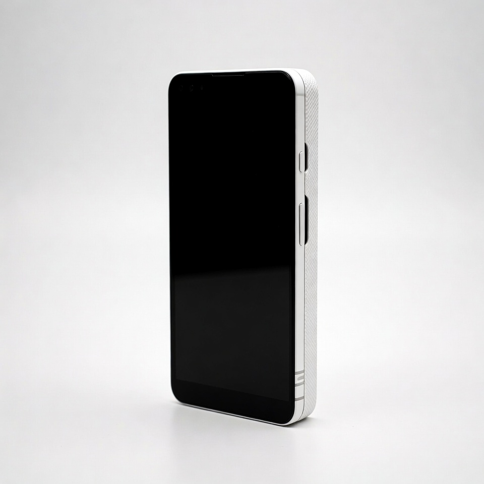 black screen, cellphone, gadget, isolated background, mobile phone, modern phone, side view, slim design, technology, volume buttons, white background, white phone, smartphone