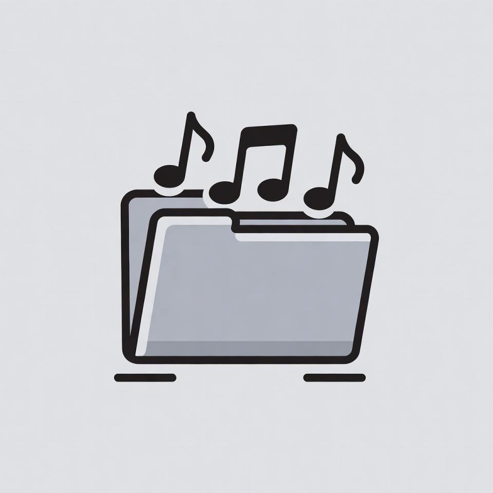 A simple flat illustration of an open gray folder with musical notes emerging from it. The notes are black and stylized above the folder on an isolated white background. The design features clean lines and a modern icon style.