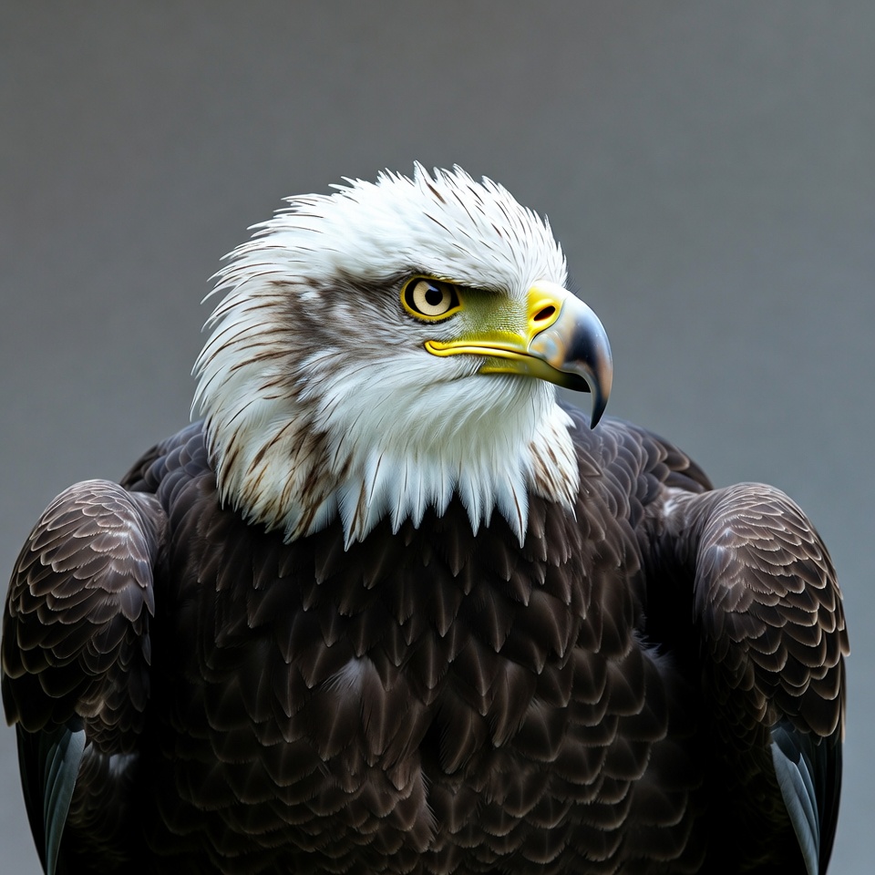 A majestic bald eagle faces forward with piercing yellow eyes and a sharp yellow beak. Its white head feathers contrast with the dark brown body and wings. The bird is isolated against a plain gray background.