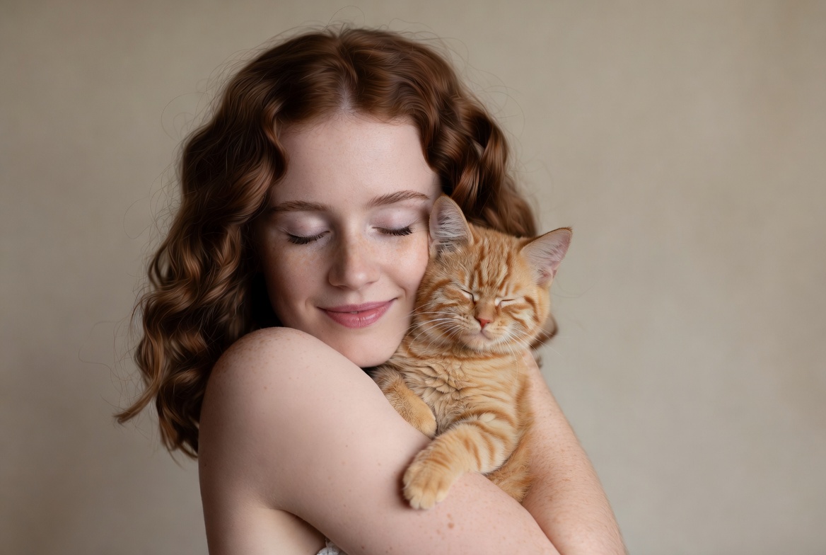 White, animal, cat, close-up, curly hair, female, hugging pet, indoor, kitten, light background, orange cat, pet, portrait, red hair, smiling woman, tabby kitten, young woman, woman