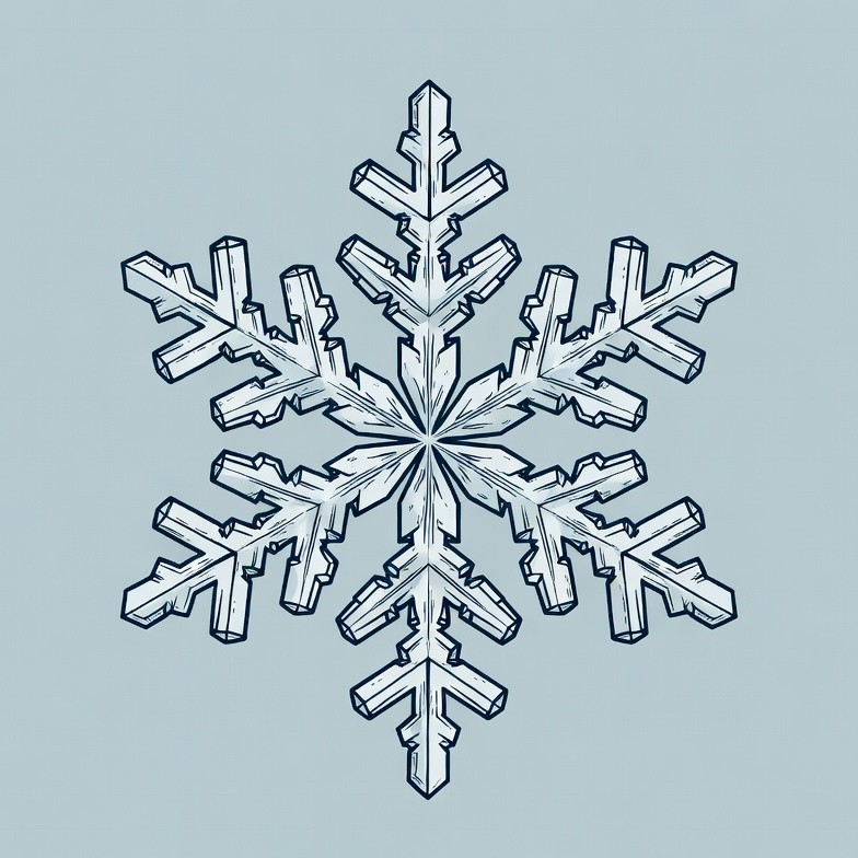 A detailed snowflake illustration features symmetrical branches with pointed tips on a light blue background. The design uses white line art to create a realistic ice crystal appearance. It is centered and isolated against the solid background.
