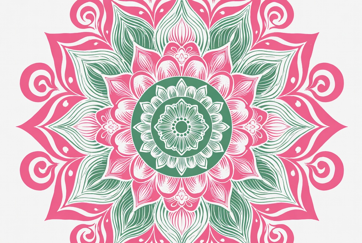 abstract, circular pattern, clipart, decorative, detailed, floral mandala, flower design, green mandala, illustration, indian mandala, isolated background, leaves, ornate, petals, pink mandala, swirls, symmetrical design, vector art, zen art, mandala