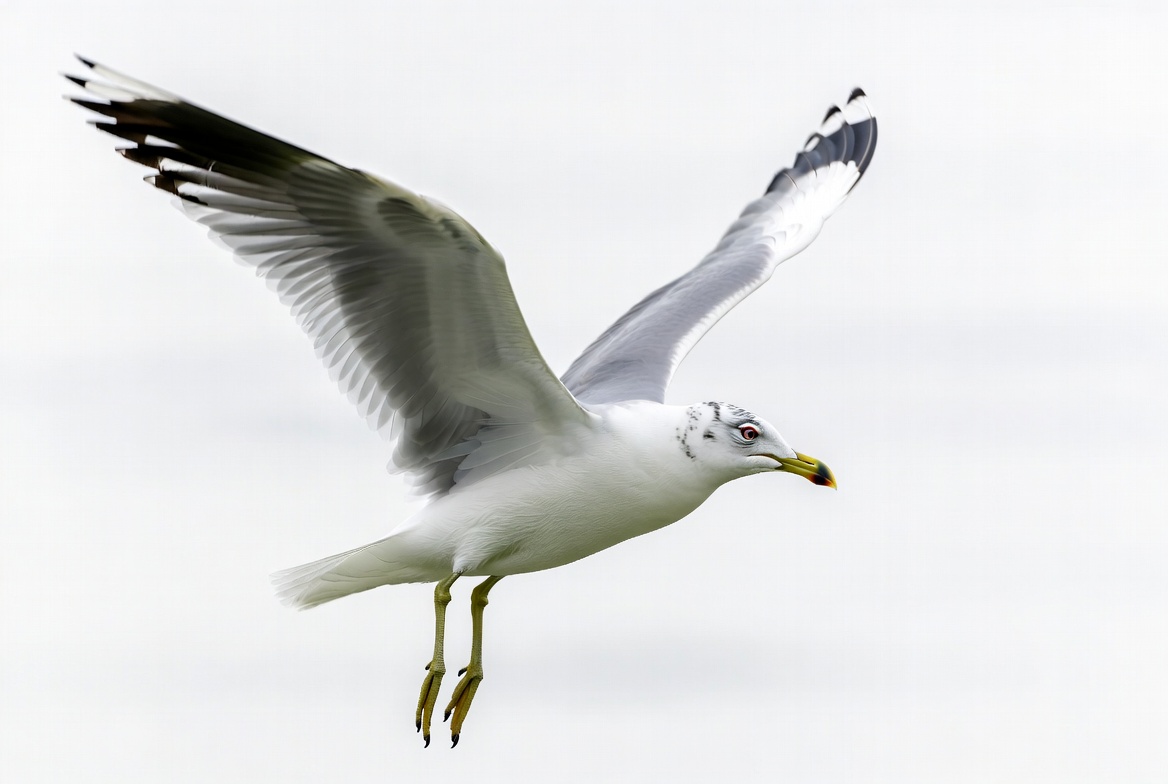 A white seagull flies with its wings fully extended against a plain light background. It has black wingtips, a yellow beak, red markings near the eye, and orange legs dangling below. The bird faces slightly to the left in mid-flight.