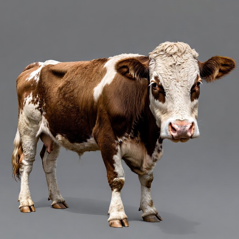Holstein cow, animal, black white cow, bovine, dairy cow, farm animal, gray background, isolated background, large ears, livestock, pink nose, spotted cow, standing cow, udder, cow