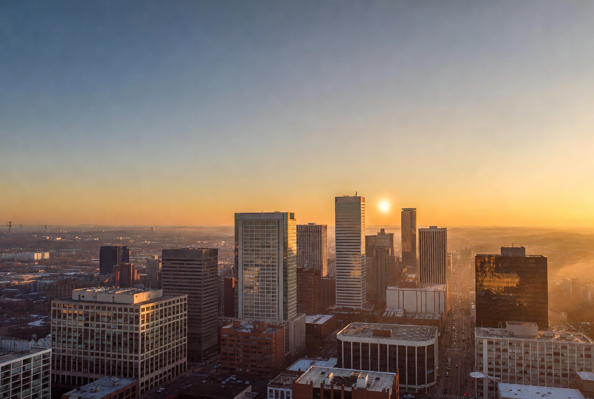 aerial view, buildings, city lights, cityscape, downtown, dusk, golden hour, high-rise buildings, horizon, metropolis, modern architecture, orange sky, skyscrapers, sun, sunset, towers, urban landscape, city skyline