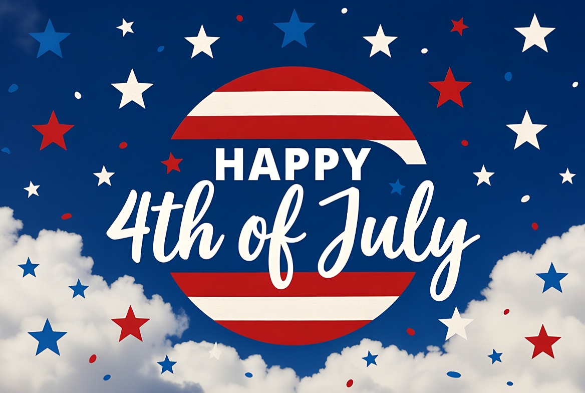A vibrant illustration features 'Happy 4th of July' text in bold red, white, and blue colors. A striped circular emblem surrounds the top text, set against a navy background with white stars, clouds, and confetti. Patriotic elements dominate the festive design.