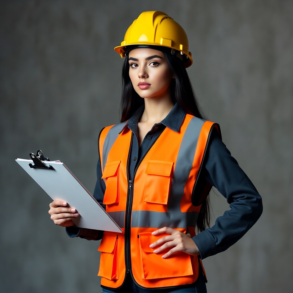 A young woman with long dark hair wears a yellow hard hat and orange safety vest over a dark shirt. She holds a white clipboard in one hand and places the other on her hip, standing confidently against a gray background. Her expression is serious and professional.
