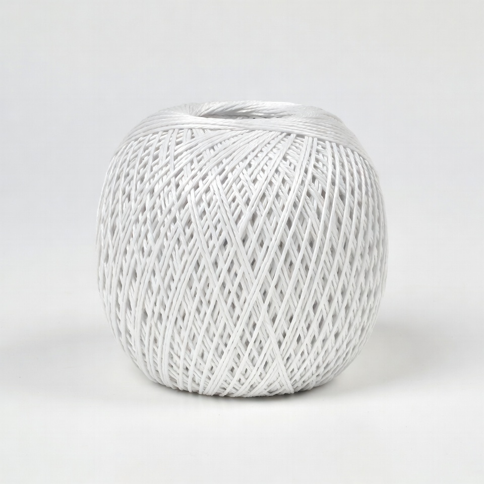 A round ball of white yarn sits on a plain white background. The yarn is neatly wound with visible texture and strands. It is isolated for clear visibility.