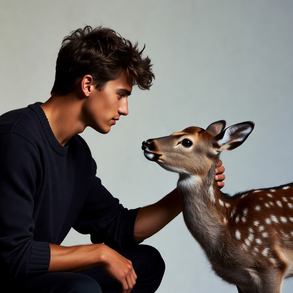 A young man with tousled dark hair kneels and gently touches the face of a spotted fawn. He wears a black sweater and looks closely at the deer, which stands on a plain light gray background. The fawn has large eyes and distinctive white spots on its light brown fur.
