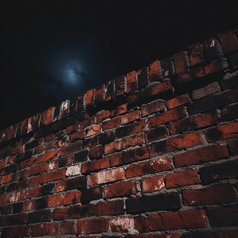 brick texture, bricks, cracks, dark background, full moon, lunar light, moon glow, moonlight, moss, night sky, nighttime, old bricks, red bricks, sky, urban wall, wall edge, weathered wall, brick wall