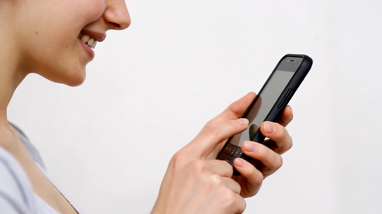 A young Asian woman with long dark hair smiles while looking at her smartphone held in her hands. She wears a light gray top and is shown in a close-up profile view against a white background. Her fingers are tapping on the phone screen.