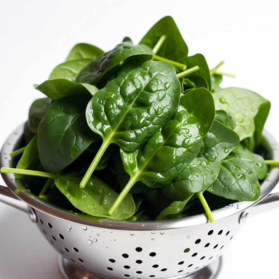 A pile of vibrant green spinach leaves fills a shiny metal colander. Water droplets glisten on the crinkled leaves, highlighting their freshness. The spinach is isolated against a plain white background.