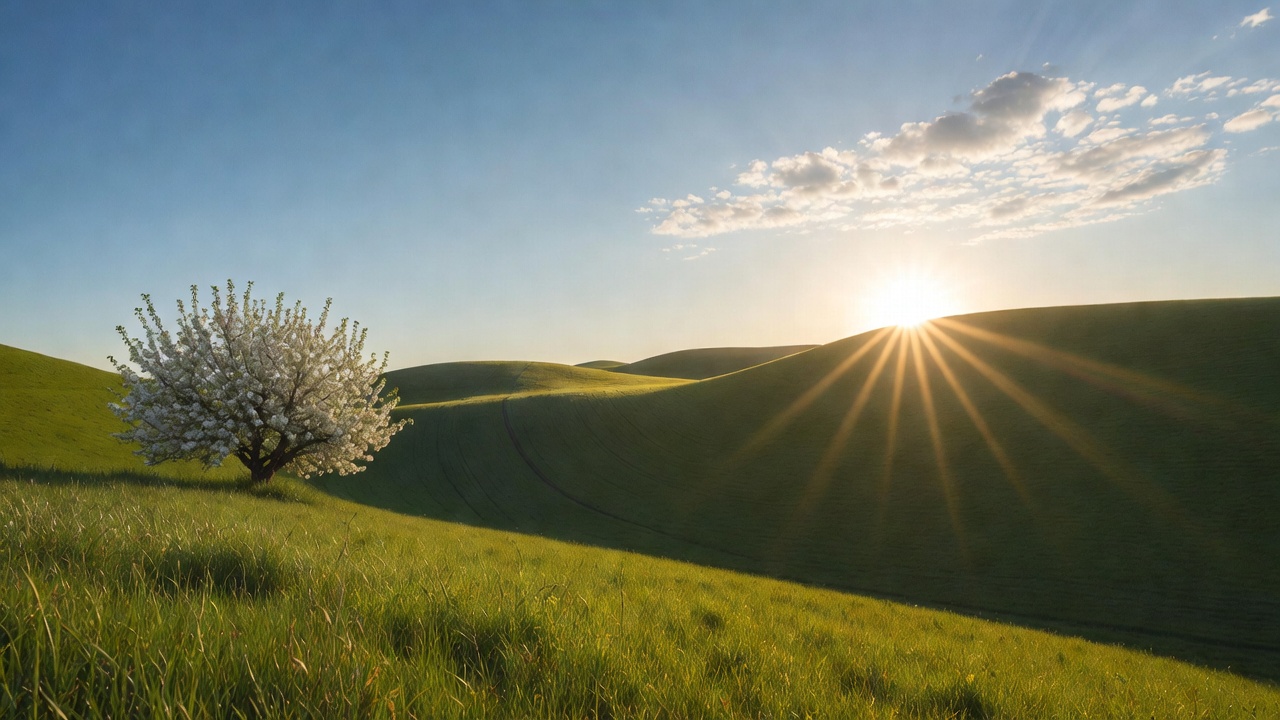 A single white cherry blossom tree stands on rolling green hills under a clear blue sky. The sun sets behind the hills, casting golden sun rays and illuminating the vibrant green grass. Fluffy white clouds dot the sky.