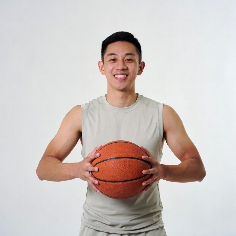 A young Asian man with short black hair smiles while holding an orange basketball in front of his chest. He wears a sleeveless gray tank top and stands against a plain white background. His muscular arms are visible as he grips the ball firmly.