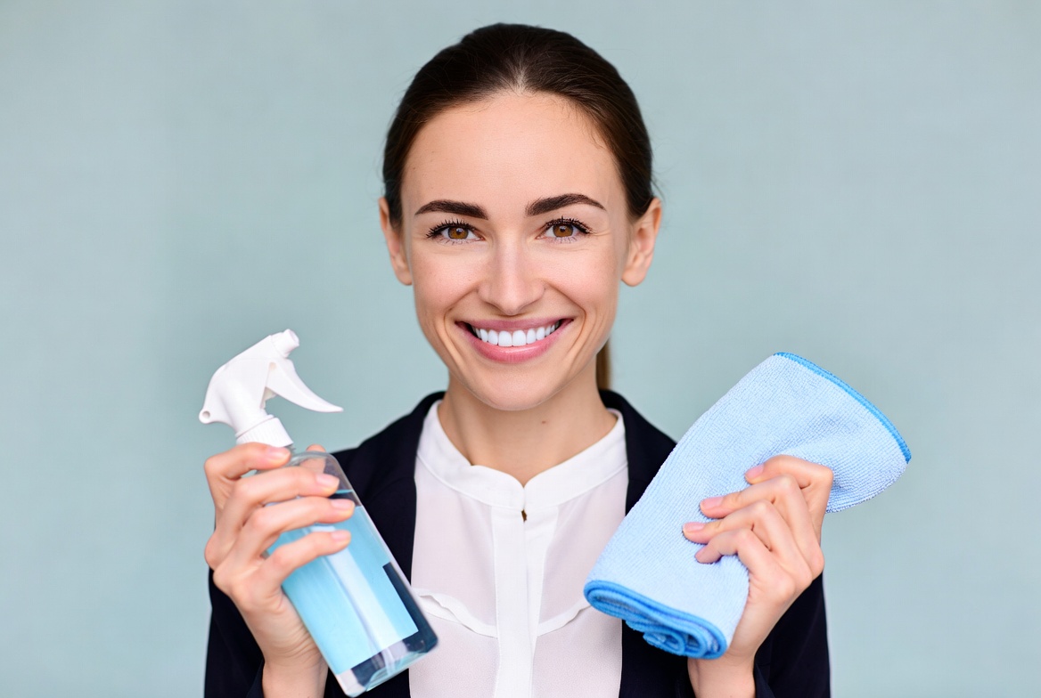 A smiling woman with dark hair stands against a light blue background, holding a blue spray bottle in one hand and a blue cleaning cloth in the other. She wears a white collared blouse and black blazer. Her expression is cheerful and confident.
