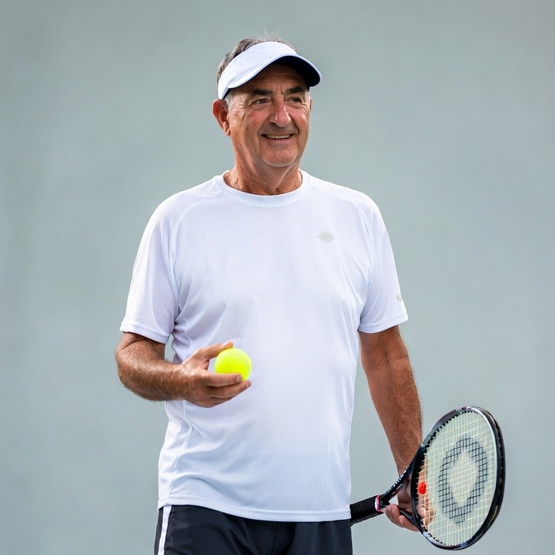 A smiling senior White man with short dark hair wears a white visor, white athletic shirt, and dark shorts on a gray background. He holds a yellow tennis ball in his left hand and grips a black tennis racket in his right hand. He stands confidently with a friendly expression.