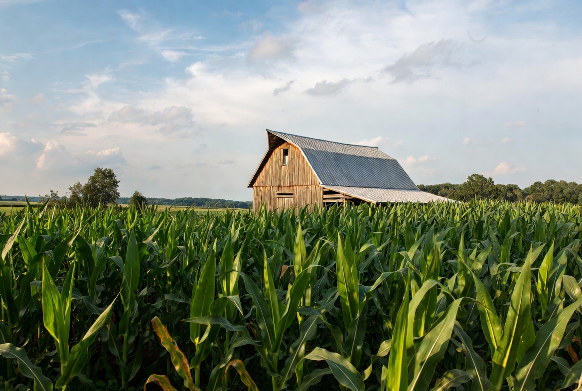 A weathered wooden barn with a metal roof stands amidst tall green cornfields under a partly cloudy sky. Surrounding trees dot the rural landscape in the background. The barn features a gambrel roof and is partially surrounded by dense rows of corn stalks.