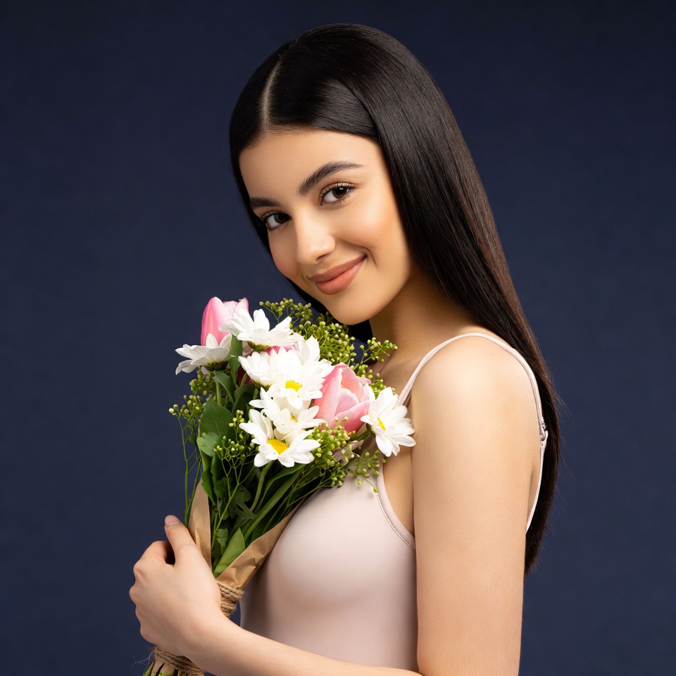 bouquet, dark blue background, female, flowers, gentle smile, holding flowers, long black hair, pink flowers, pink top, portrait, smiling, spaghetti straps, straight hair, tulips, white daisies, young woman, woman