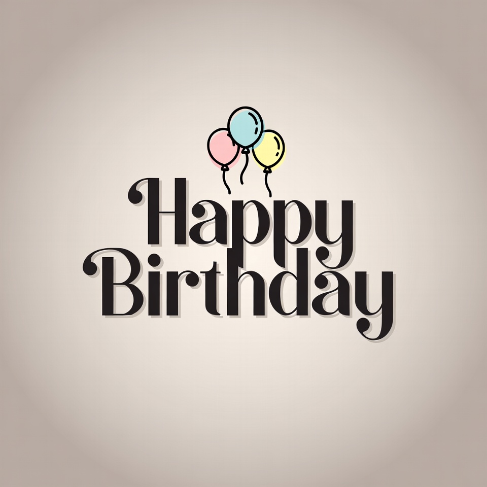 A stylized illustration features the text 'Happy Birthday' in elegant black cursive font on a light beige background. Three colorful balloons in pink, blue, and yellow float above the text. The design is simple and festive, perfect for celebrations.