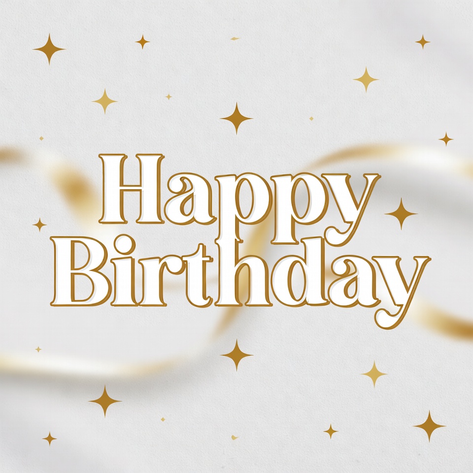 A golden 'Happy Birthday' text in elegant font sits on a white background. Golden ribbons curl around the text, and sparkling stars surround the design. The illustration features a festive, shiny metallic effect.