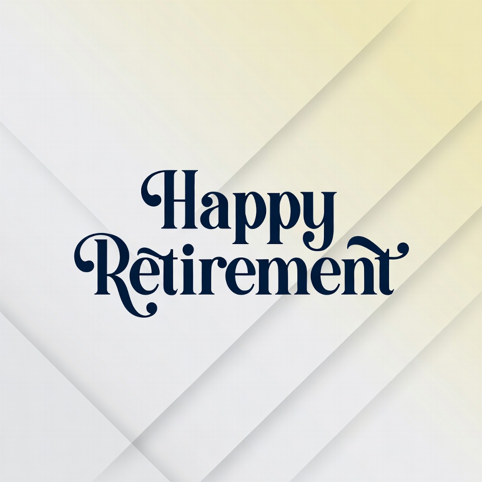 celebration, clipart, cursive font, diagonal lines, elegant script, flourish letters, graphic, greeting card, invitation, isolated background, navy blue text, retirement, text, typography, vector art, white stripes, yellow background, happy retirement