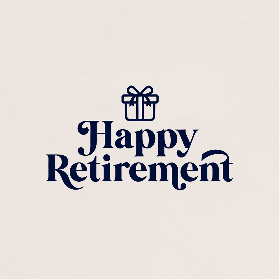 beige background, bow, celebration, clipart, cursive font, gift box, greeting card, illustration, isolated background, navy blue text, retirement, retirement party, happy retirement