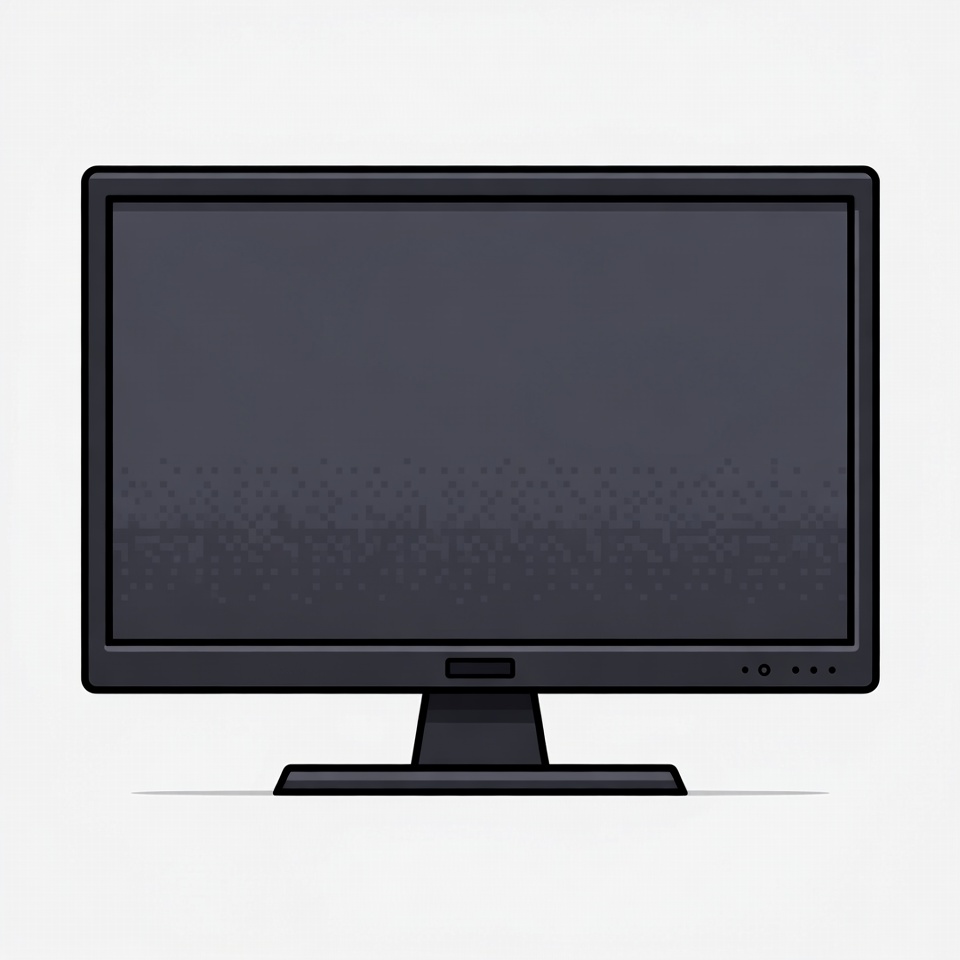A simple line art illustration of a black flat screen computer monitor on a white background. The screen is dark with a subtle gradient and the stand is sturdy and centered. It features clean outlines and minimalistic design.