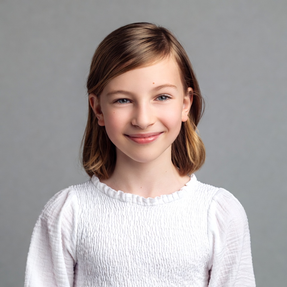 A young girl with straight light brown hair parted to the side smiles gently at the camera. She wears a white textured blouse with puffed sleeves and a ruffled collar. The portrait is set against a plain gray background.