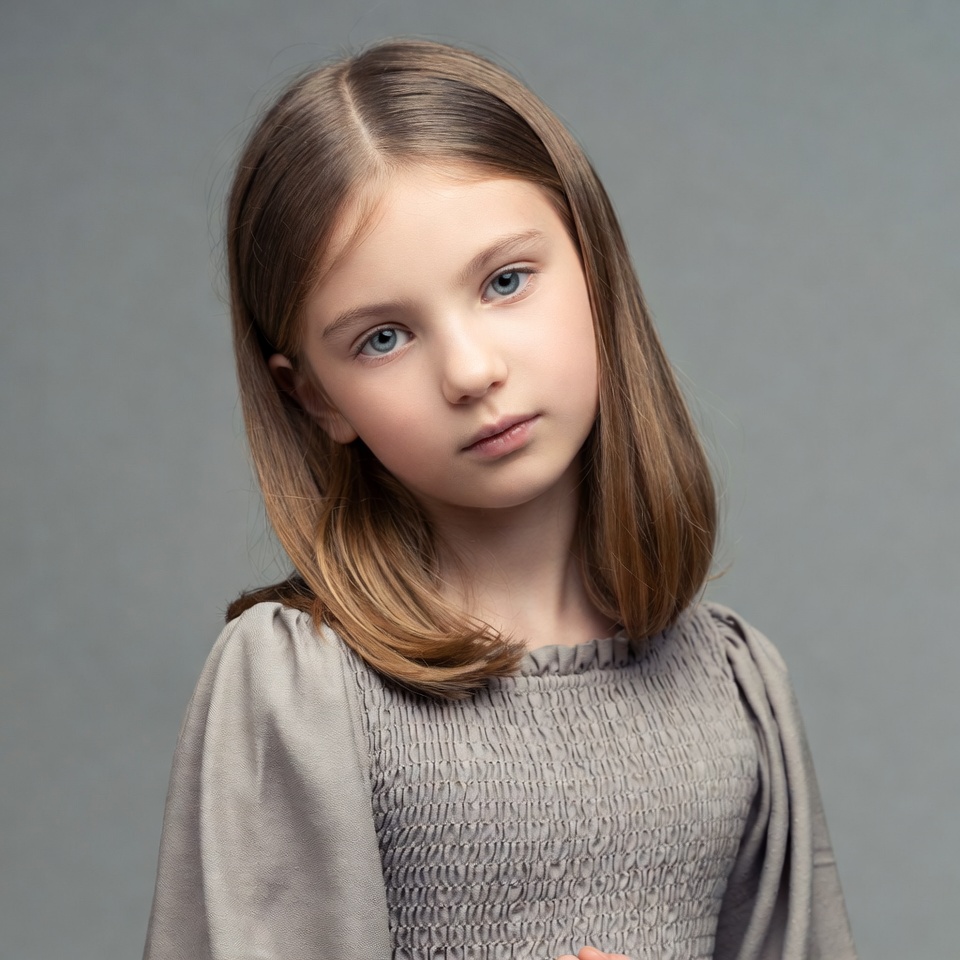 A young girl with long brown hair and blue eyes gazes slightly to the side against a plain gray background. She wears a light gray dress with puffed sleeves and ruffled neckline. Her expression is neutral and composed.