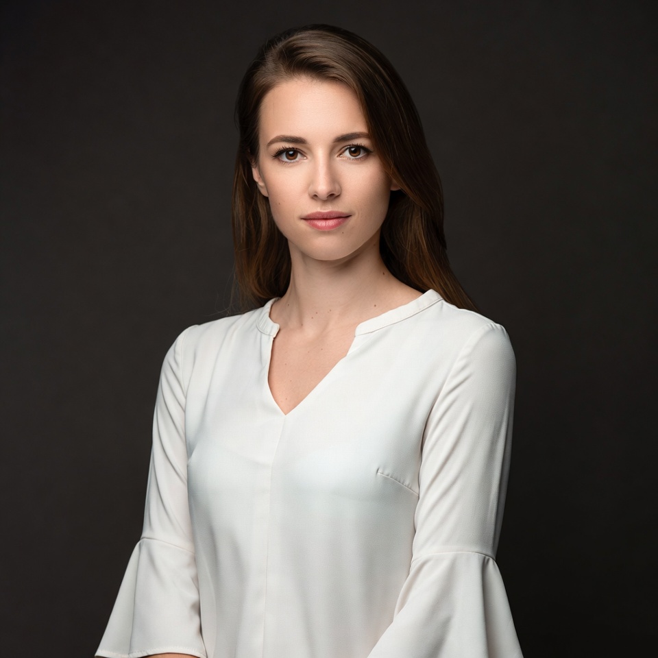 A young woman with long brown hair stands against a dark background. She wears a white collared blouse with bell sleeves and a subtle V-neck. Her expression is neutral with a slight smile, facing the camera directly.