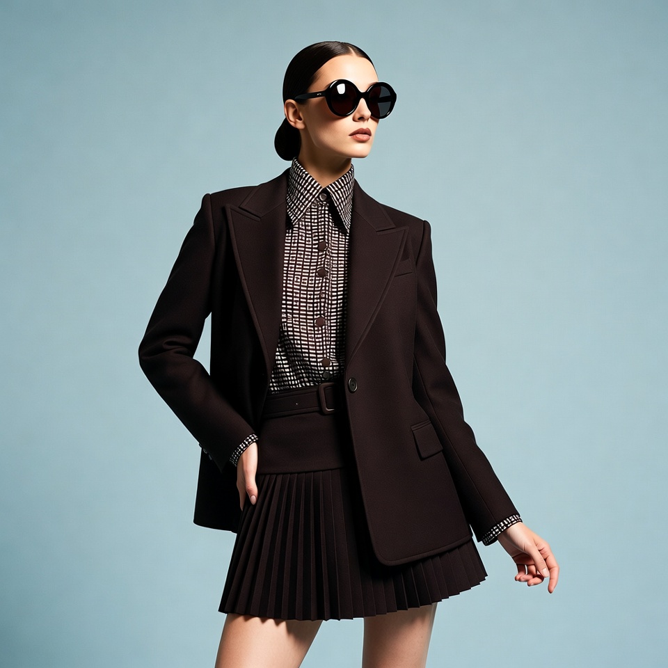 A stylish woman with dark hair in a bun wears oversized sunglasses and gazes upward against a solid blue background. She is dressed in a brown checkered blazer over a collared shirt, cinched with a belt, paired with a short pleated brown skirt. Her pose is confident with hands on hips.