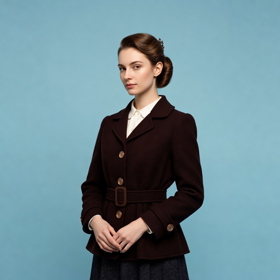 White, blue background, brown coat, brown hair, collared shirt, dark skirt, elegant pose, fashion, formal attire, hair accessory, hands clasped, retro style, side profile, studio portrait, updo hairstyle, vintage coat, white shirt, wool jacket, young woman, woman