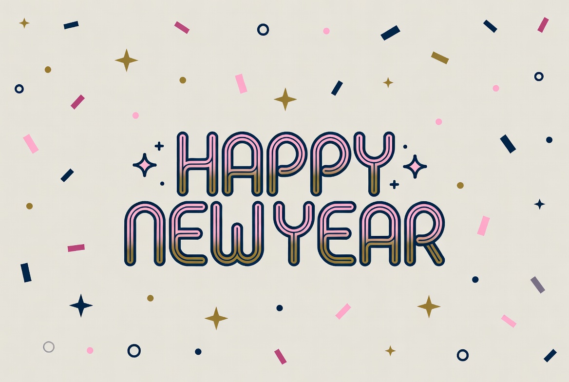 A vibrant illustration features the text 'Happy New Year' in bold, neon-style pink and purple outlined letters. The design is set against a light beige background adorned with colorful confetti, stars, circles, and dots in pink, gold, navy, and white.