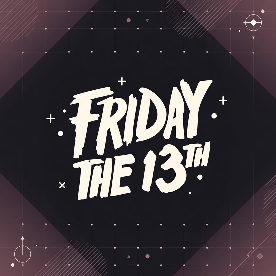 Friday 13th, Halloween, black background, bold letters, crosses, digital art, dots, futuristic, geometric shapes, graffiti font, graphic, illustration, purple accents, spooky design, square frame, stars, text, vector graphic, Friday the 13th